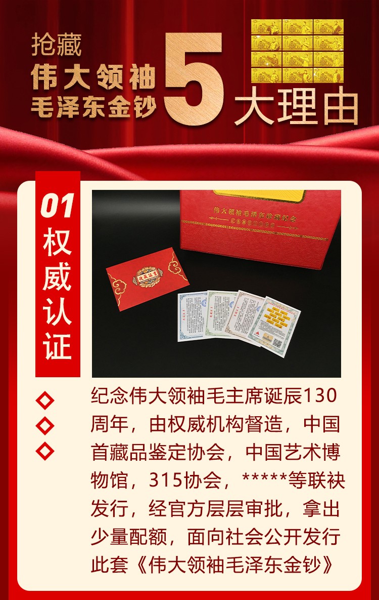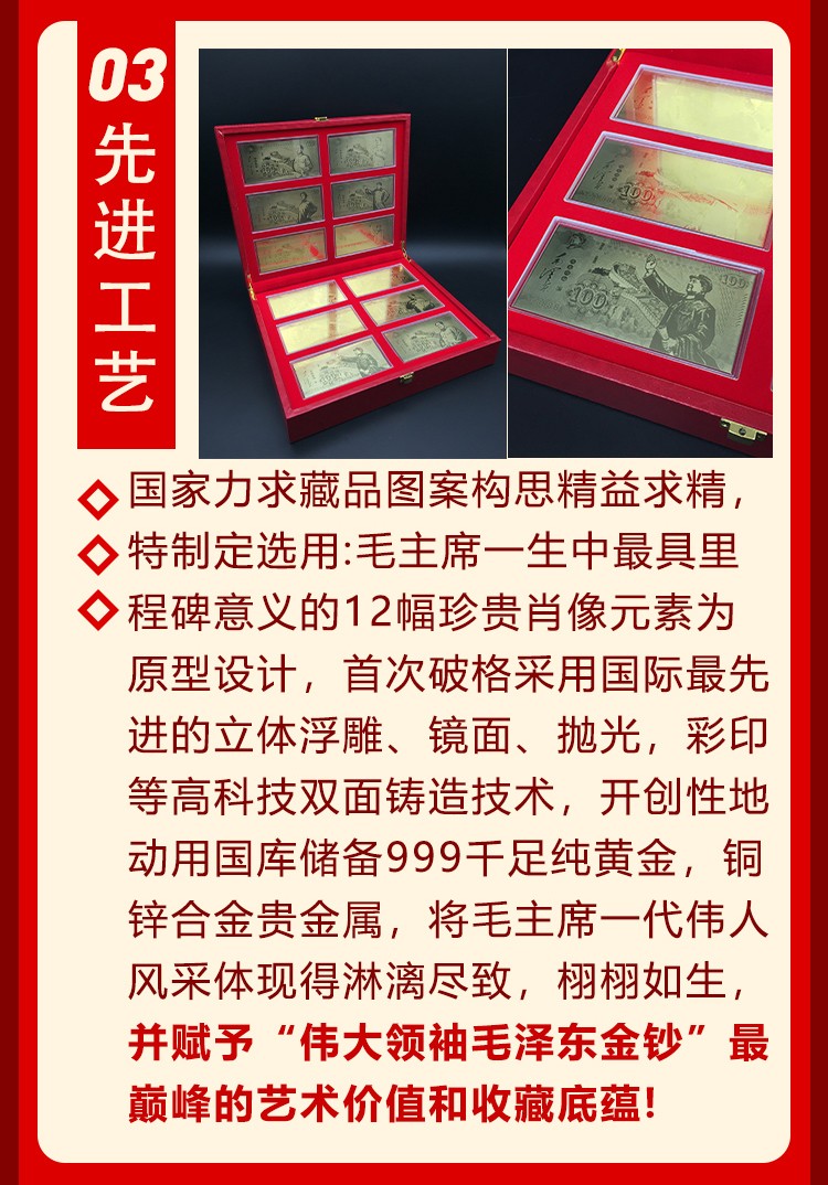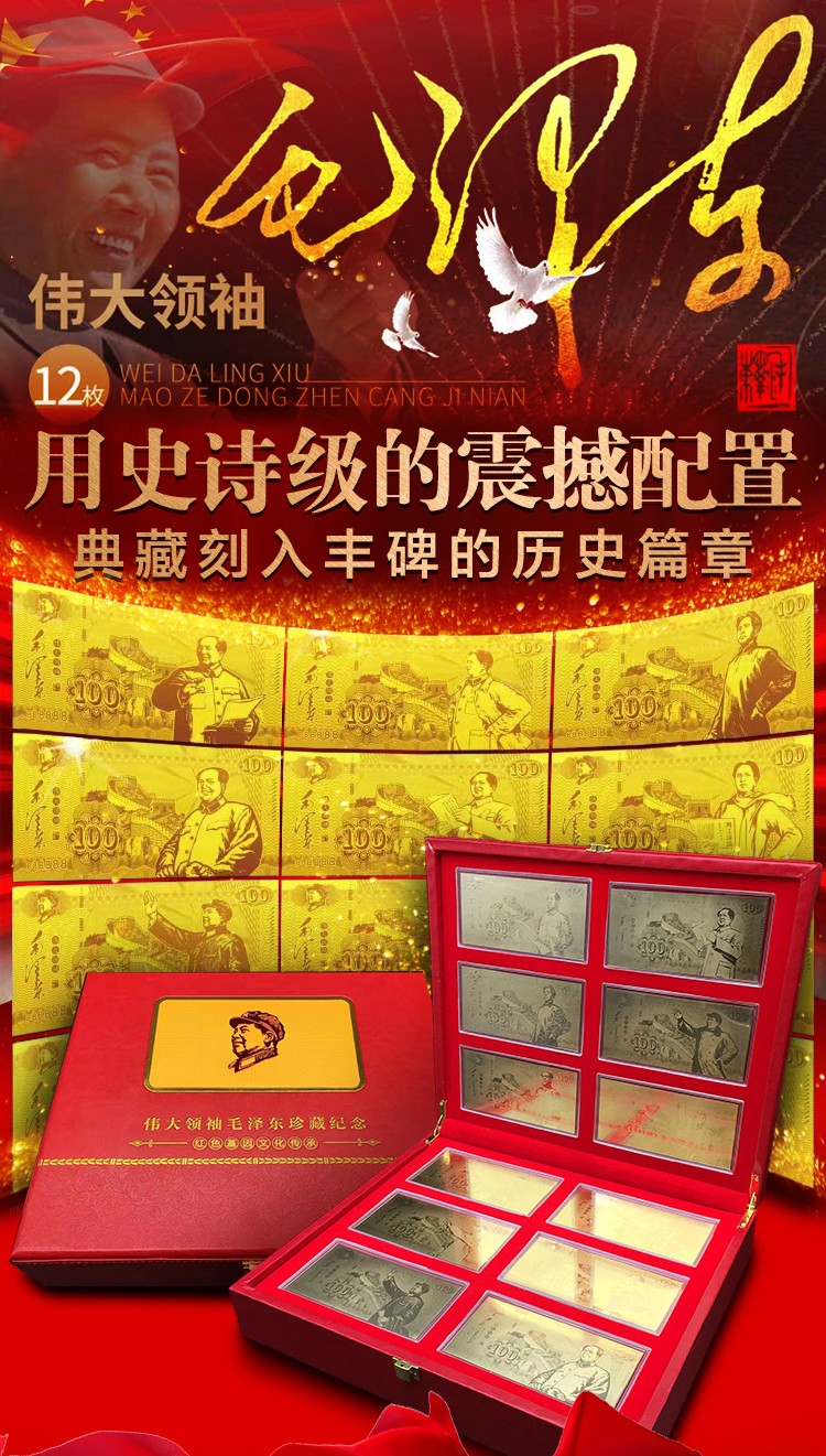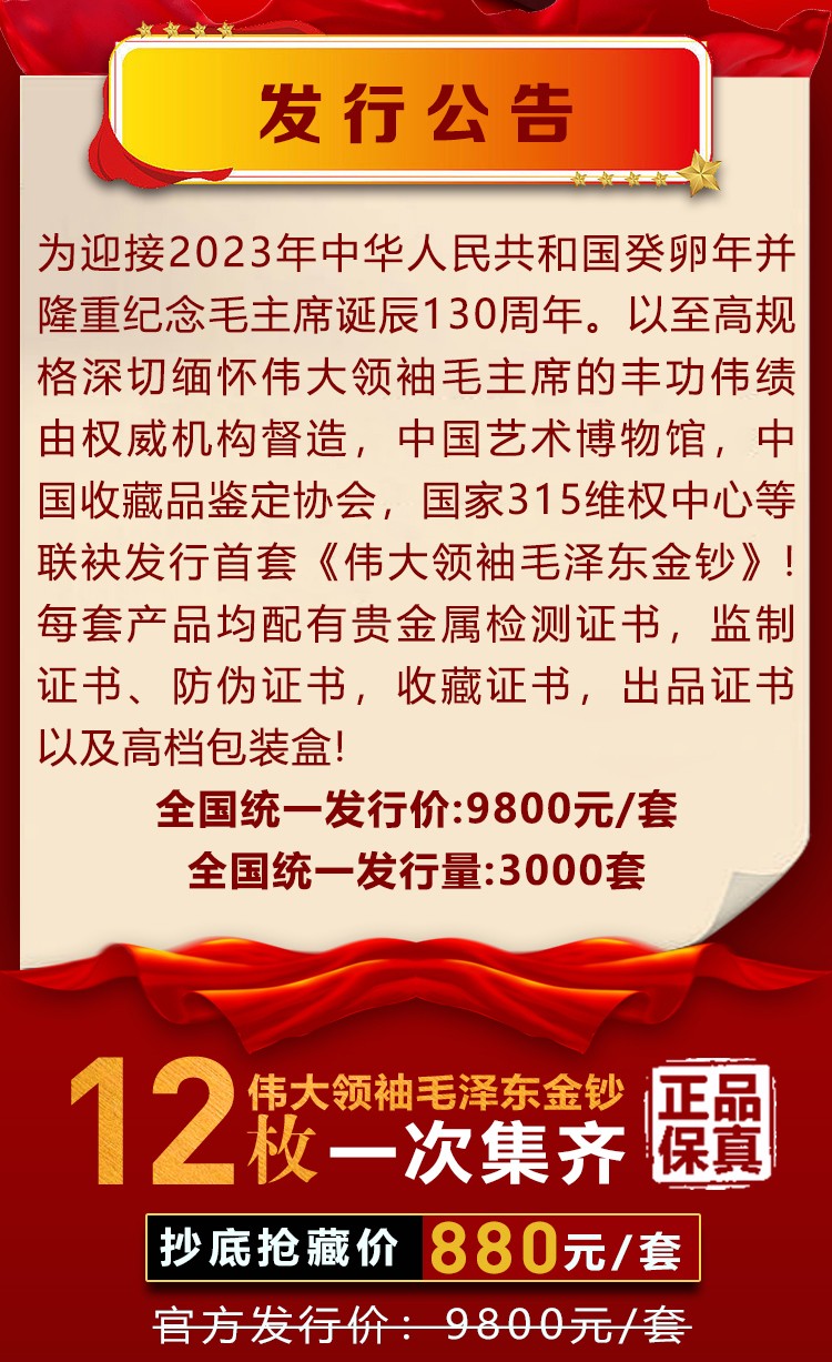 • 【伟大领袖毛泽东金钞】,国家权威部门批准特别发行,假一赔十!(原价9800元,限时抢藏880元一套),全国限量发行3000套。
