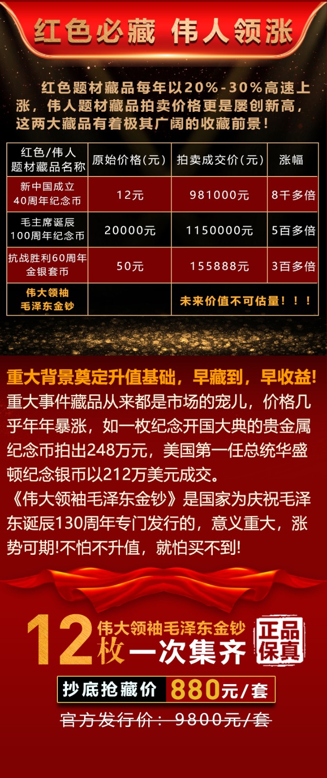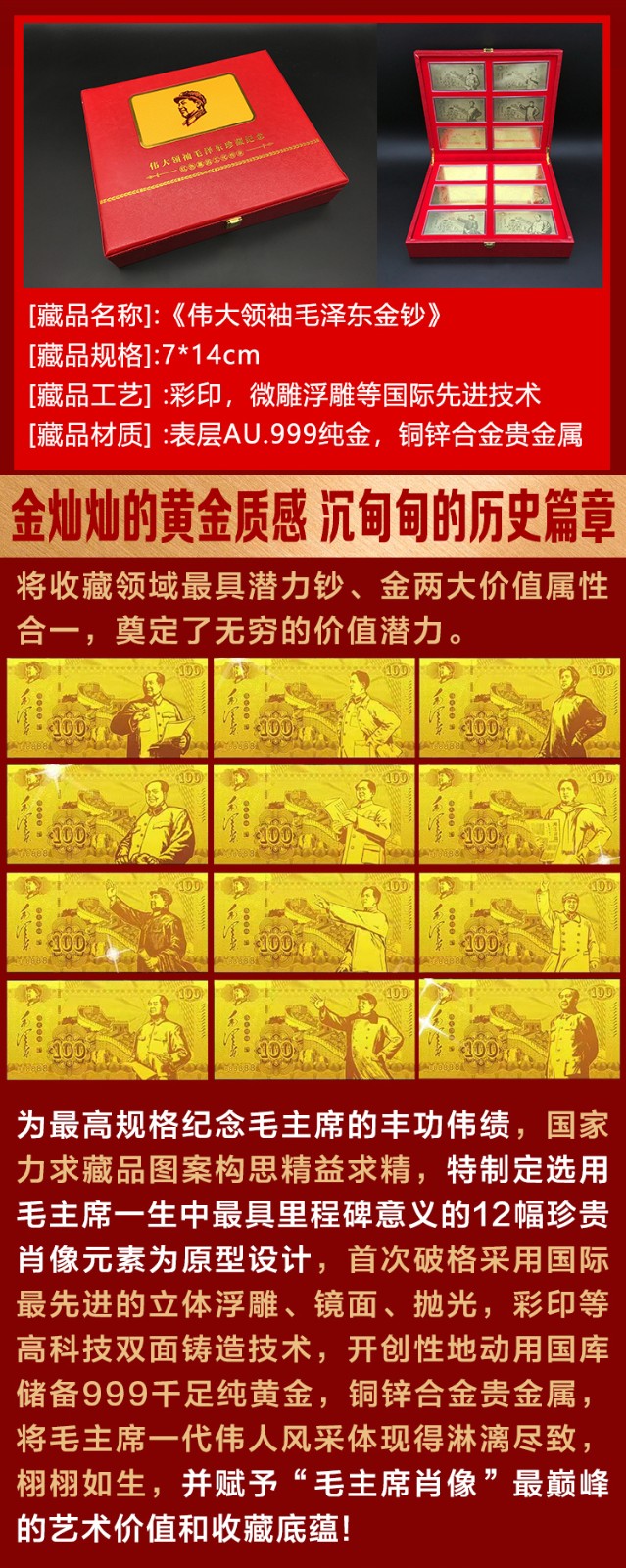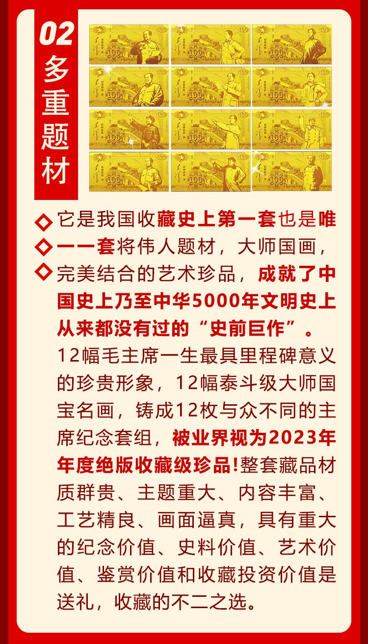 • 【伟大领袖毛泽东金钞】,国家权威部门批准特别发行,假一赔十!(原价9800元,限时抢藏880元一套),全国限量发行3000套。